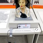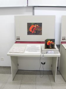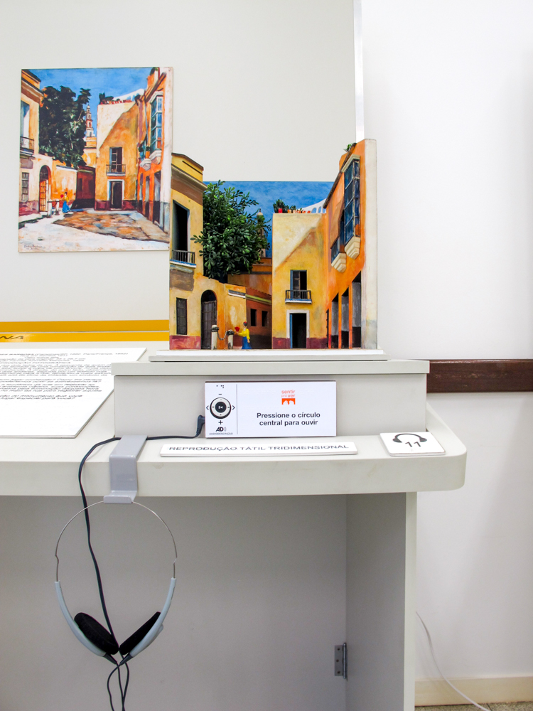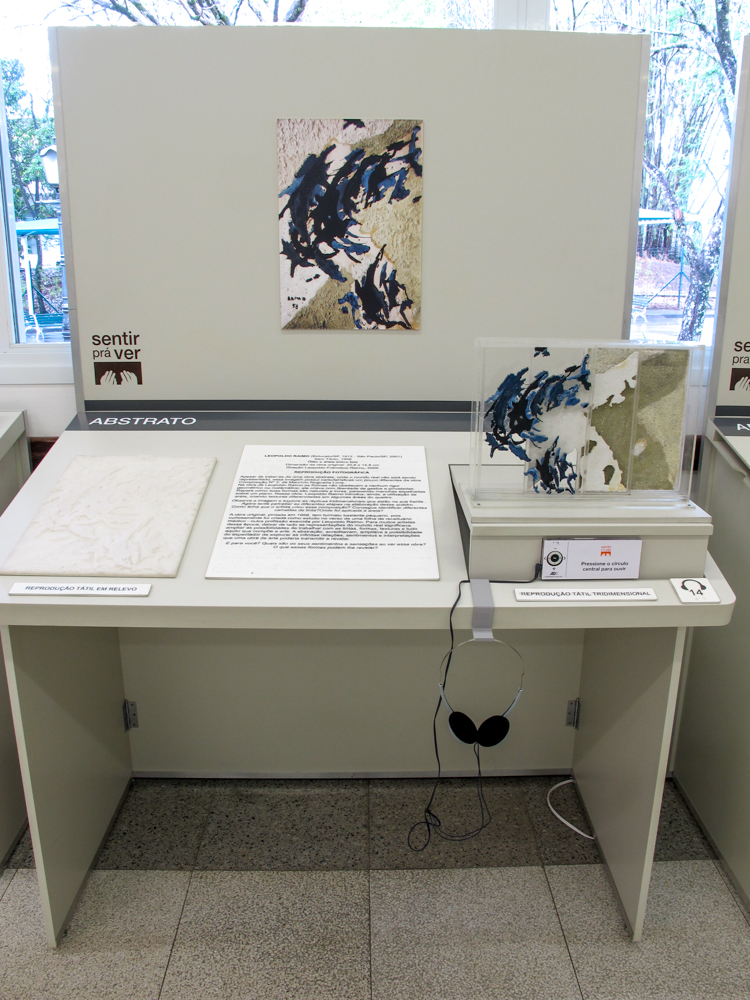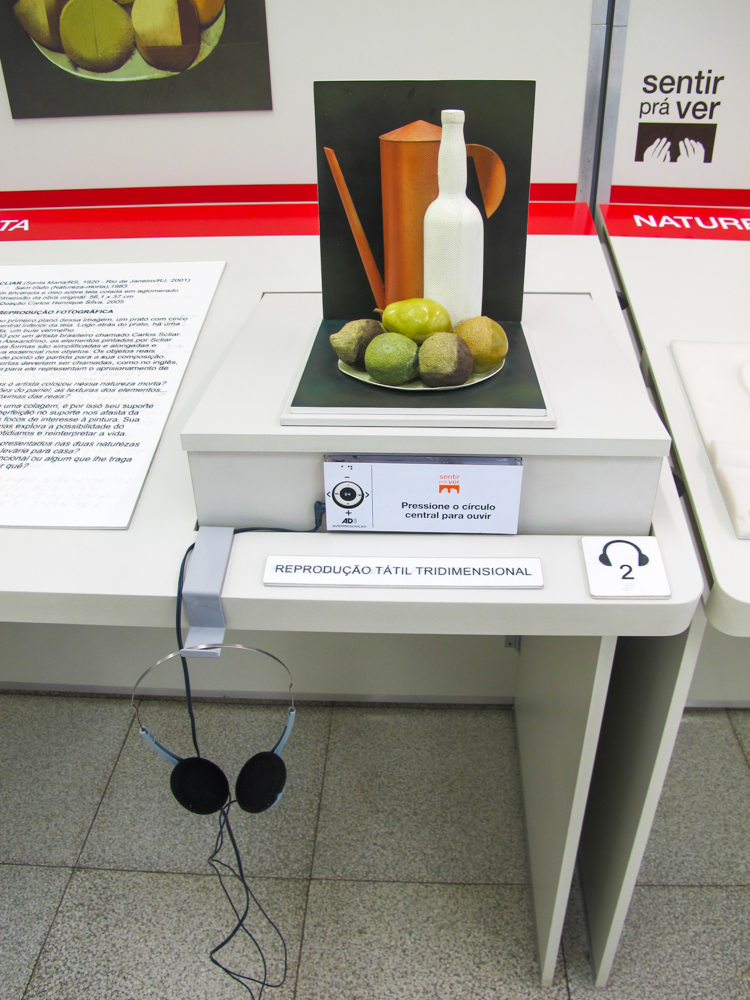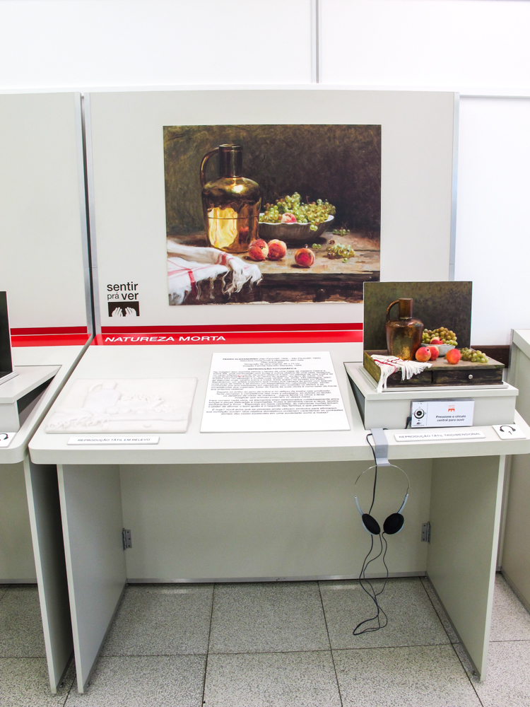 Na imagem ao lado o tema "Natureza Morta", da esquerda para direita, o módulo expositivo apresenta a obra mais clássica com reprodução fotográfica de Pedro Alexandrino "Uvas e Pêssegos" e a mais contemporânea de Carlos Scliar, cada módulo contem: maquete tátil com aromatização, texto em dupla leitura (tinta e braille), relevo tátil de resina acrílica, prancha em alto contraste e audiodescrição mediadora da obra.